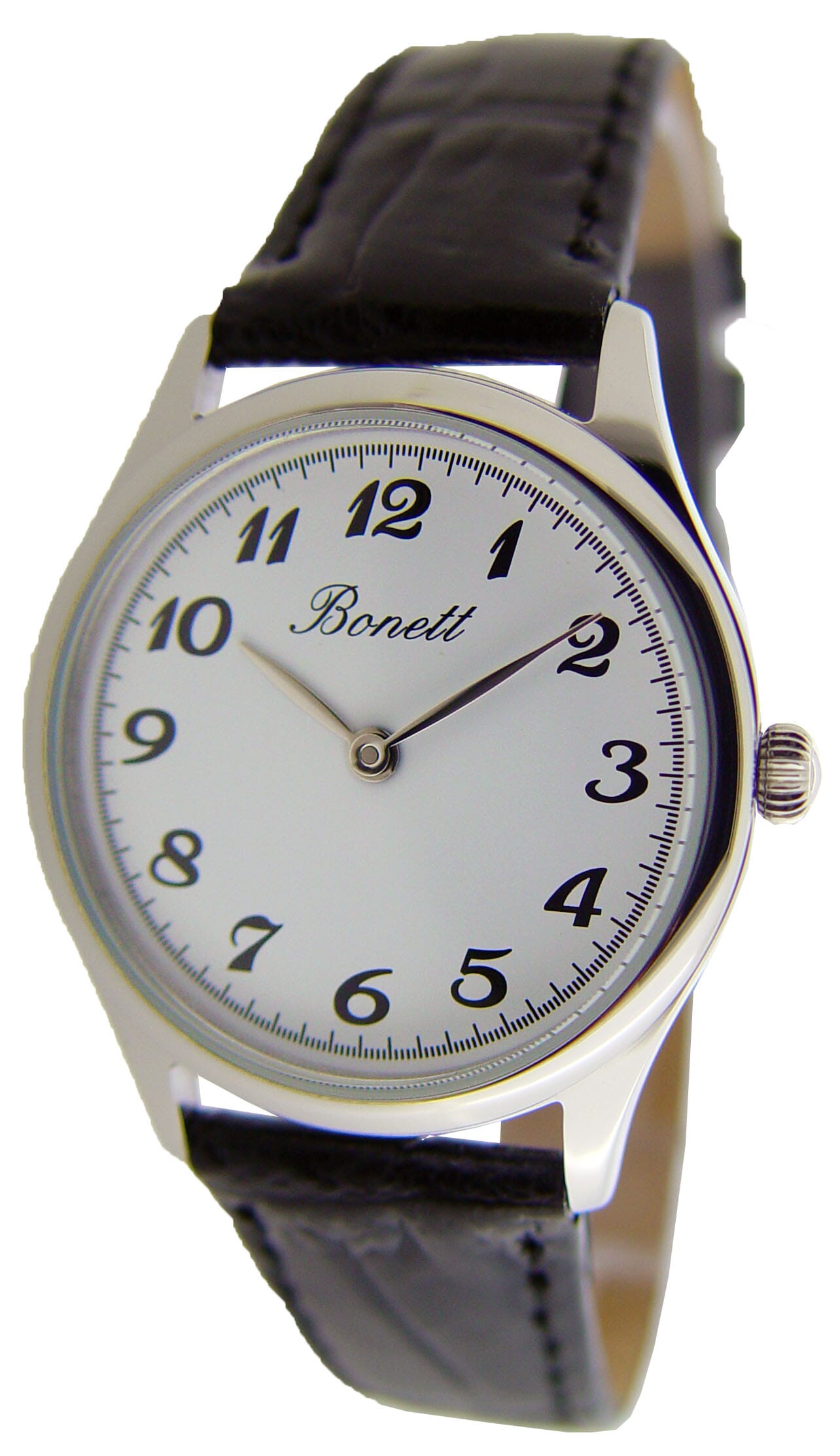Bonett dameklokke stål hvit skive tall